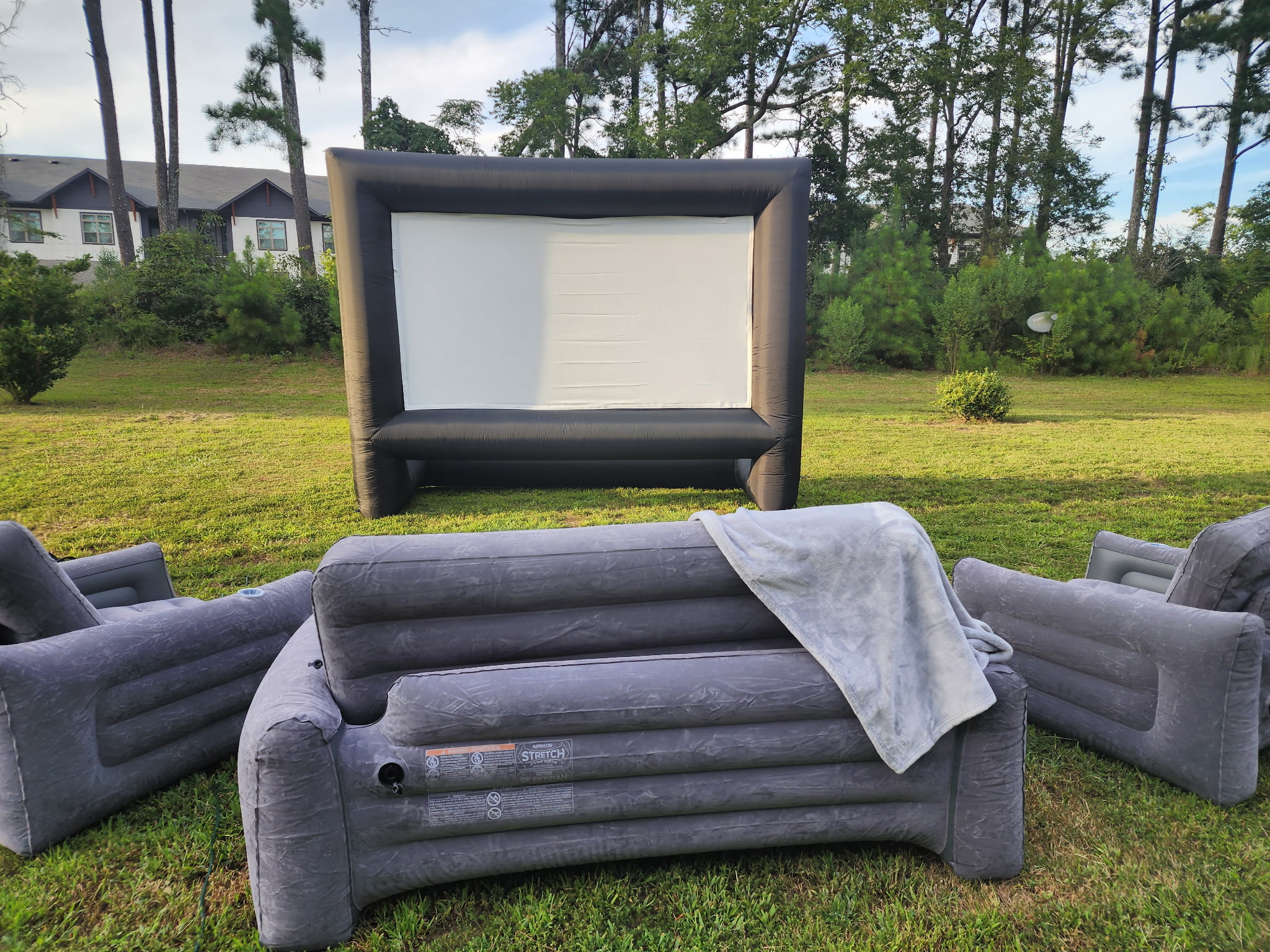 Perfect for cozy backyard movie nights! Includes a high-definition projector, giant inflatable screen, comfy inflatable couch set, powerful Bluetooth speaker, and a classic popcorn machine for that authentic theater feel.
