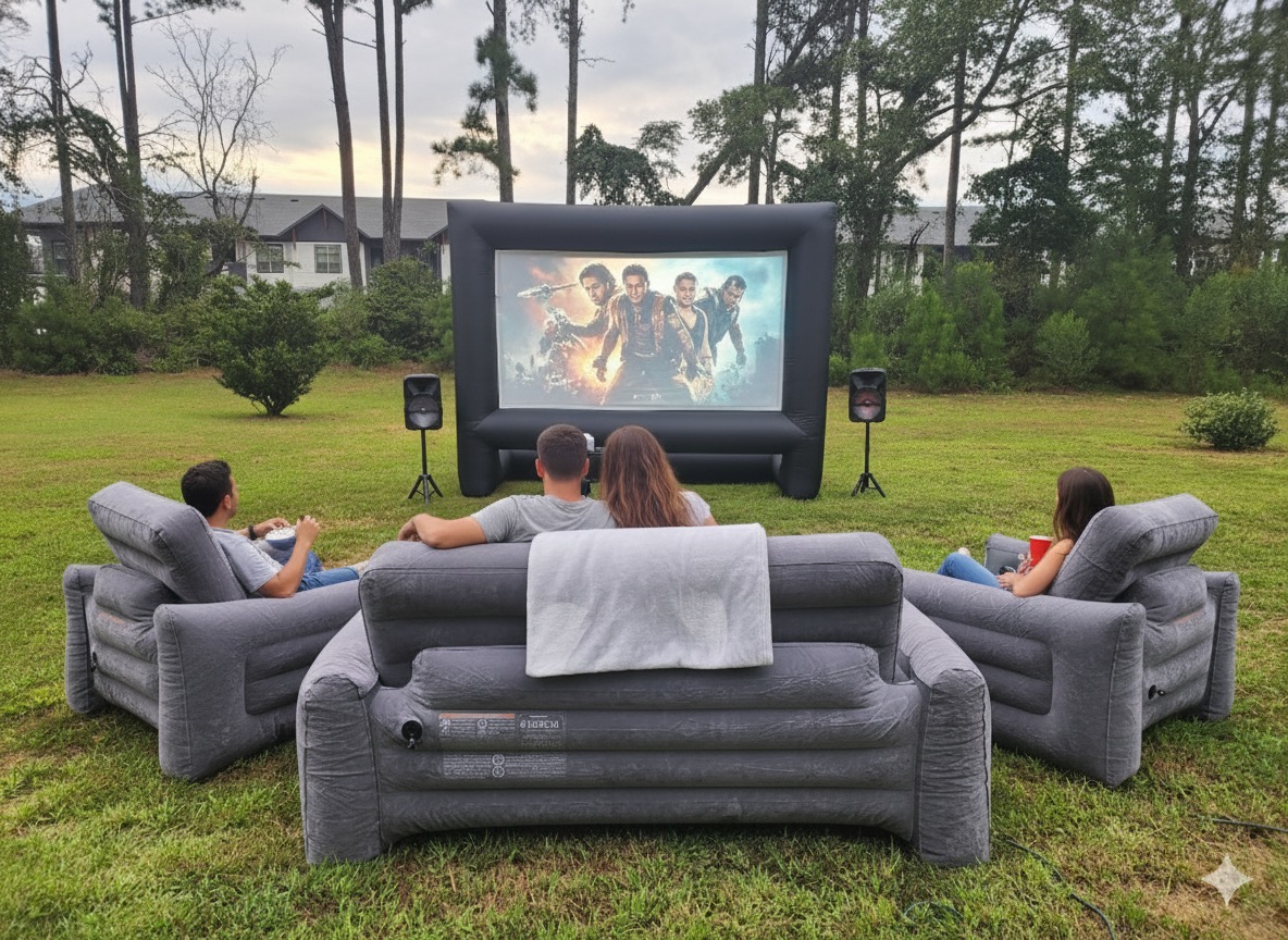 Perfect for cozy backyard movie nights! Includes a high-definition projector, giant inflatable screen, comfy inflatable couch set, powerful Bluetooth speaker, and a classic popcorn machine for that authentic theater feel.